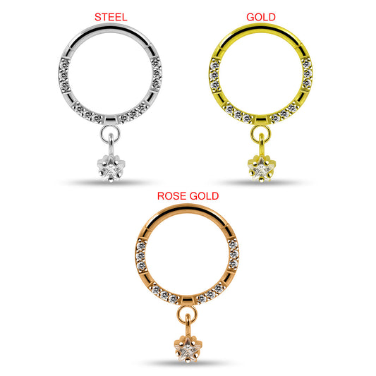 316L Surgical Steel CZ Jewelled Dangling Star Hinged Segment Clicker Hoop