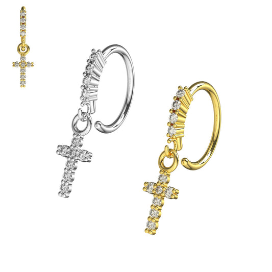 316L Surgical Steel CZ Jewelled Dangling Cross Hinged Earring Pair