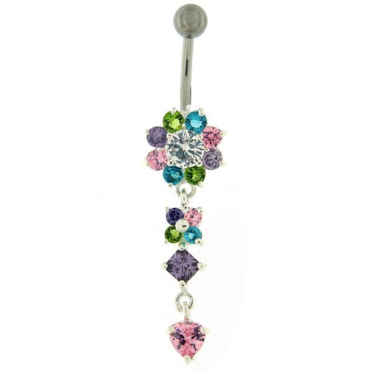 925 Sterling Silver Flower with Stones Jewelled Fancy Dangling Belly Ring
