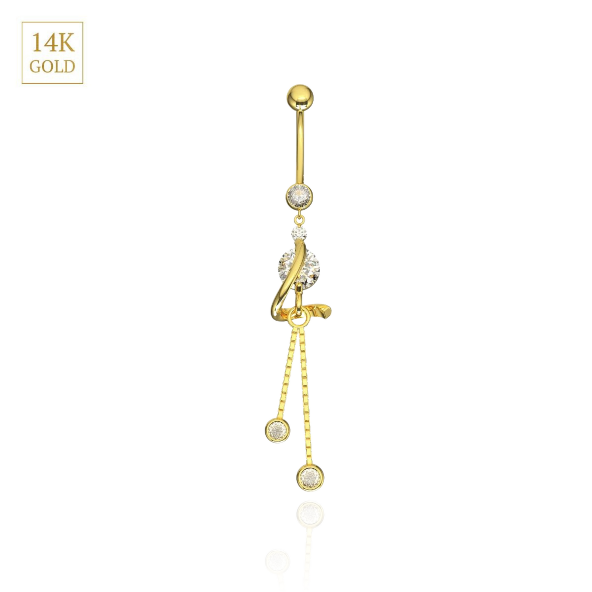 A graceful belly button ring crafted from 14K Gold, featuring a sparkling cubic zirconia centerpiece wrapped with a delicate gold swirl. Two elegant dangling chains with additional stones add movement and sophistication. A perfect piece to elevate any jewellery collection with subtle charm and shine.