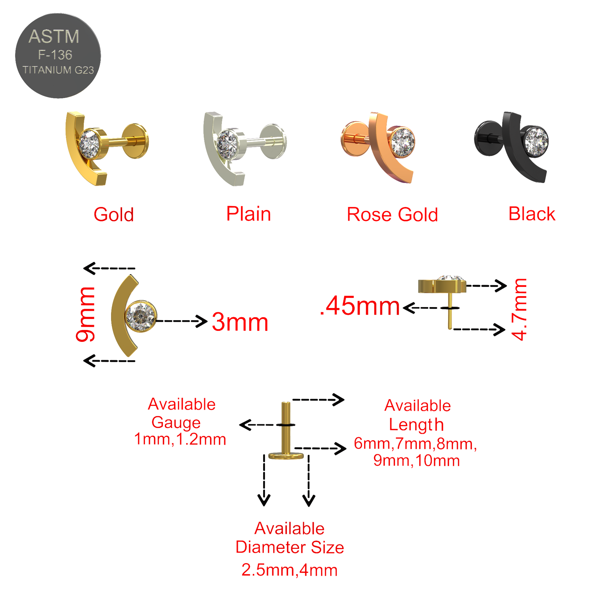Crafted from premium G23 Titanium, this labret combines exceptional strength with biocompatibility, making it ideal for sensitive skin. The design features a dazzling round cubic zirconia paired with a sleek curved accent, creating a unique and modern look. Perfect for everyday wear, it offers both durability and contemporary style in one elegant piece.